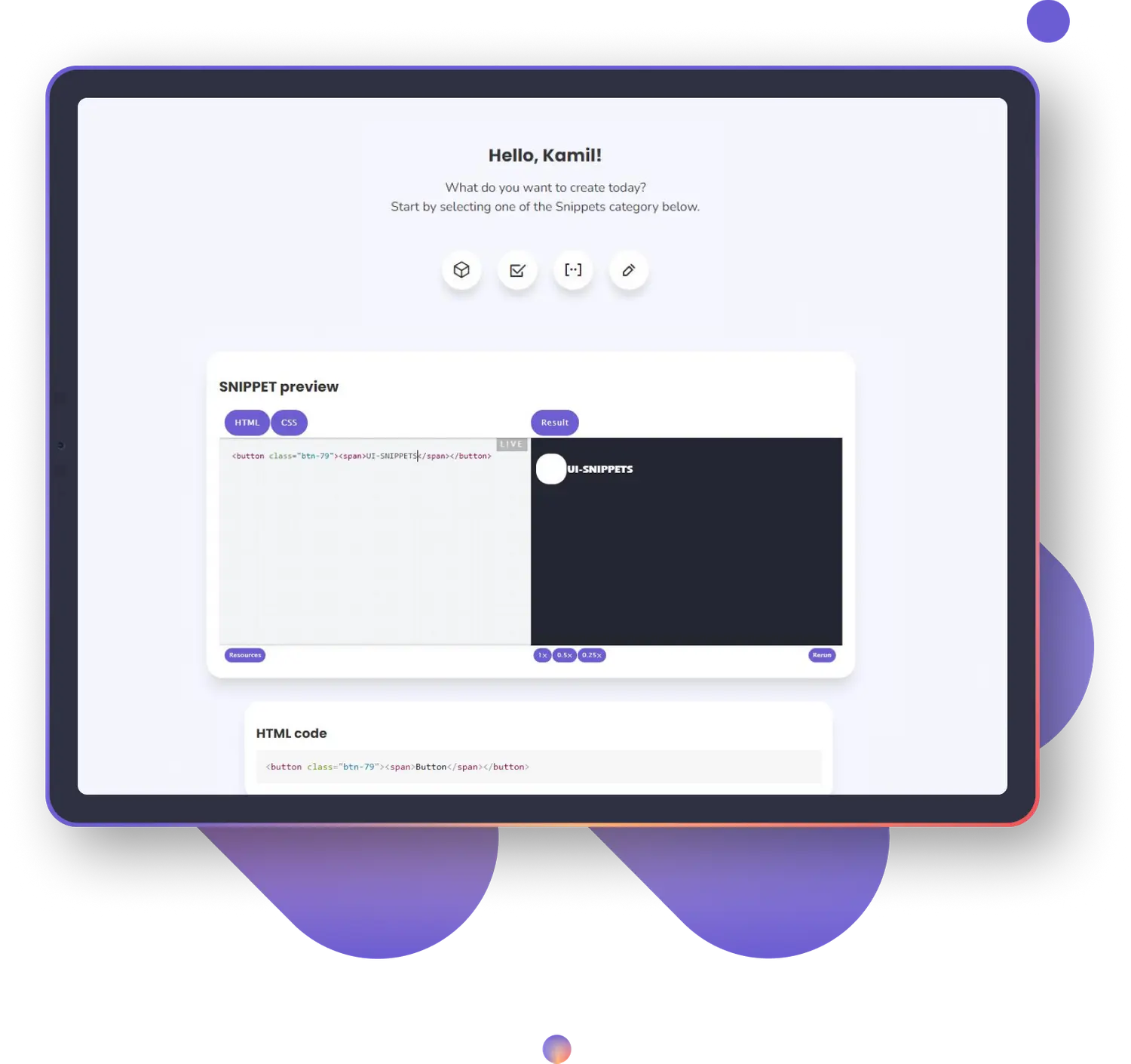 The UI-snippets library contains more than 200 free open source HTML & CSS snippets. You can find buttons, checkboxes, toggle switches and inputs. With your snippets library you can create any kind of snippet, and you are not limited to mentioned categories.